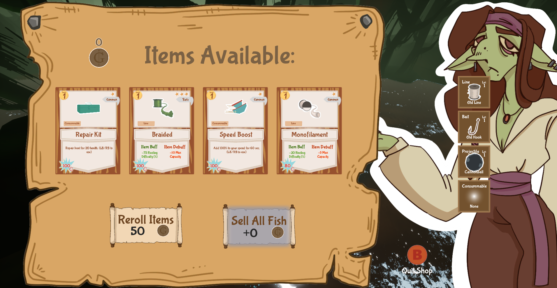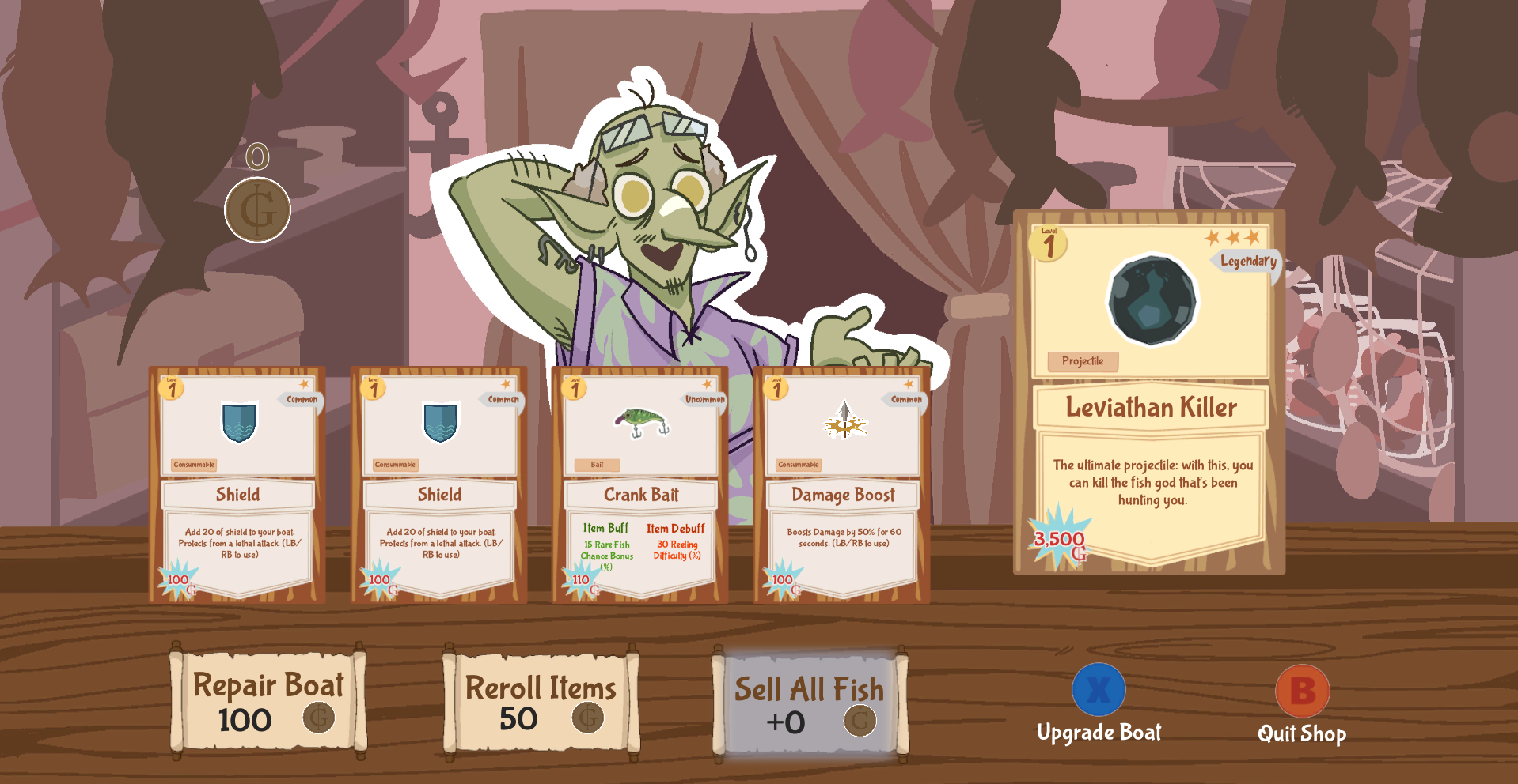 Sellfish is a roguelike-adventure game about a goblin braving the seas to net exotic fishes and sell them to amass great riches. Explore, fish, upgrade your ship and sell to your heart's content, but be too greedy and face the wrath of the Greed God himself...